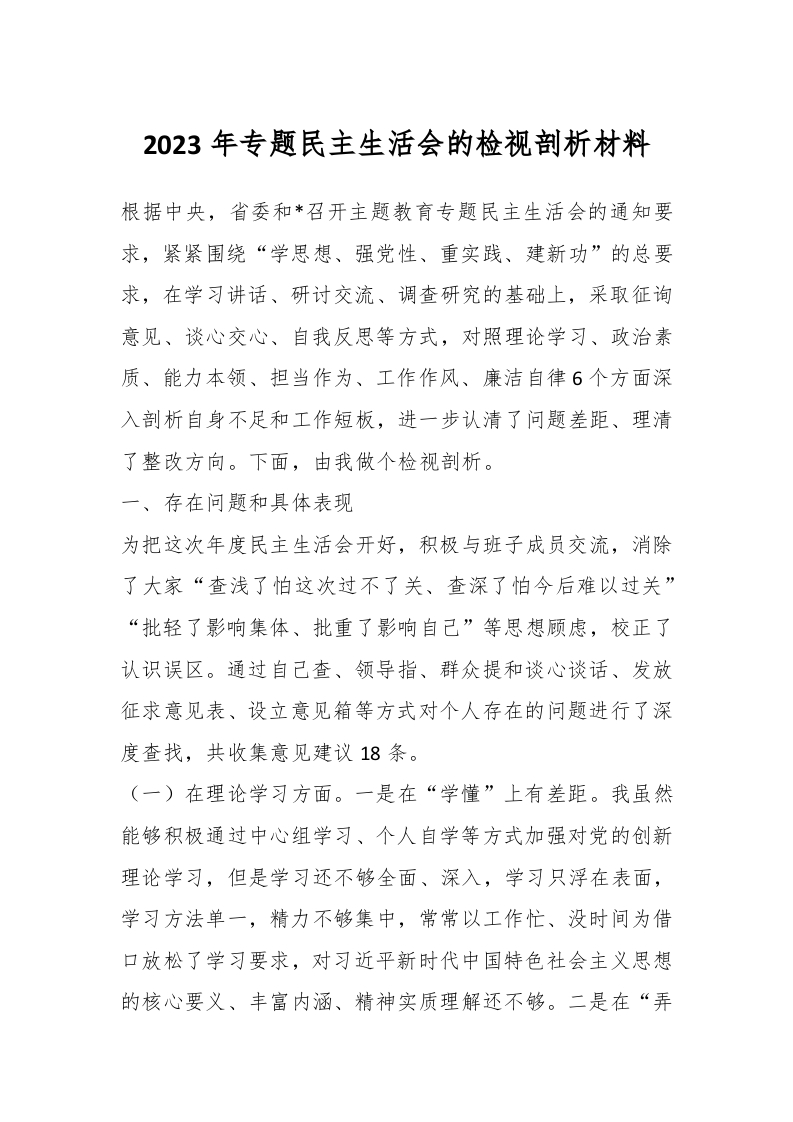 / 2023年专题民主生活会的检视剖析材料