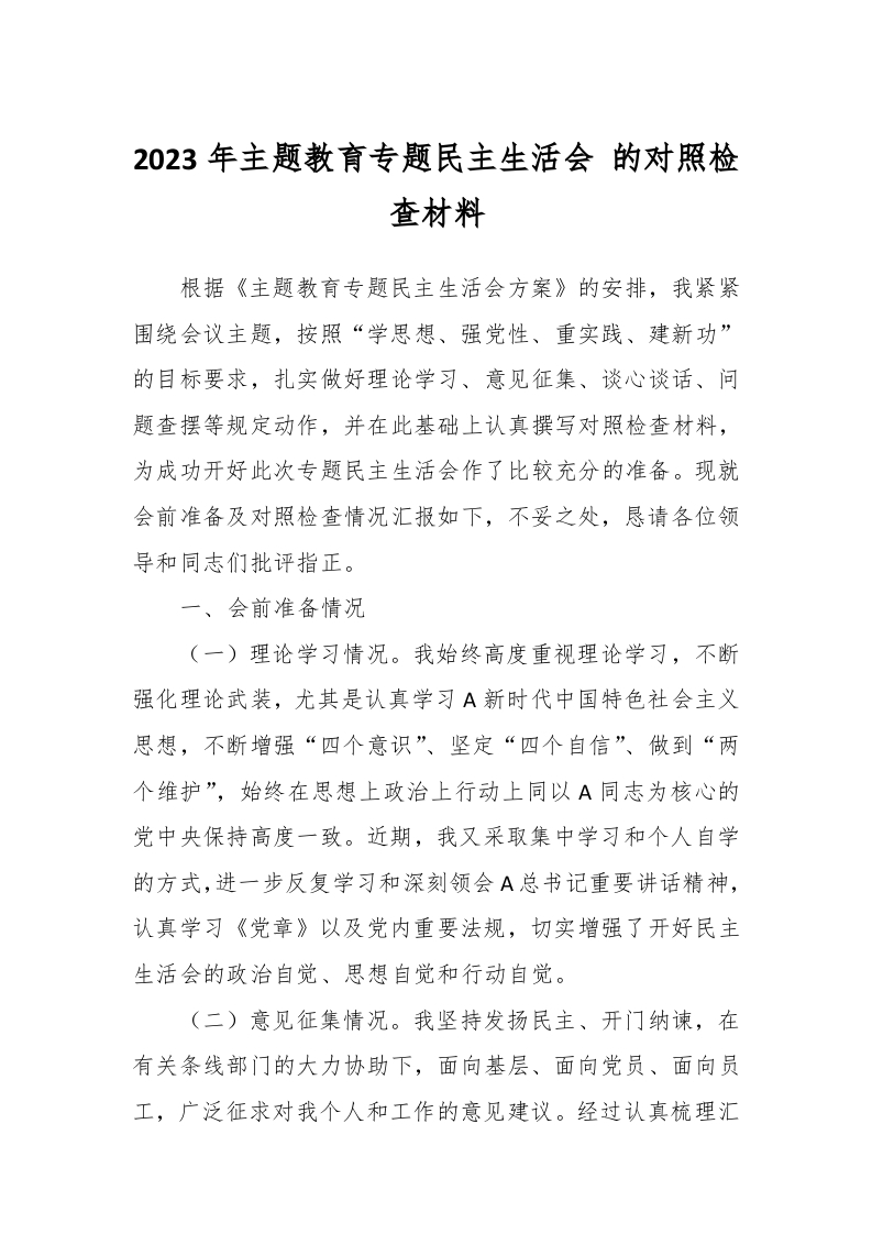 / 2023年主题教育专题民主生活会 的对照检查材料