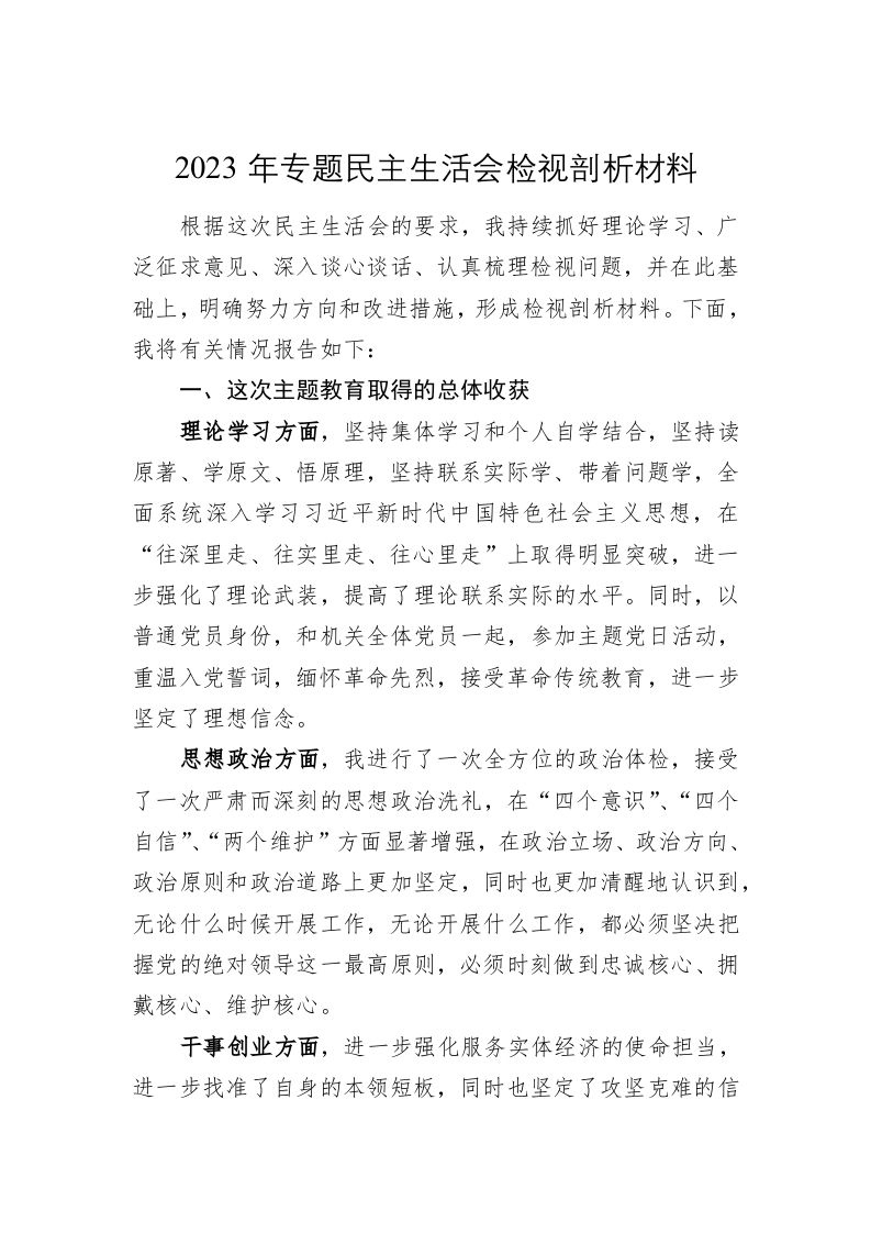 / 2023年专题民主生活会检视剖析材料