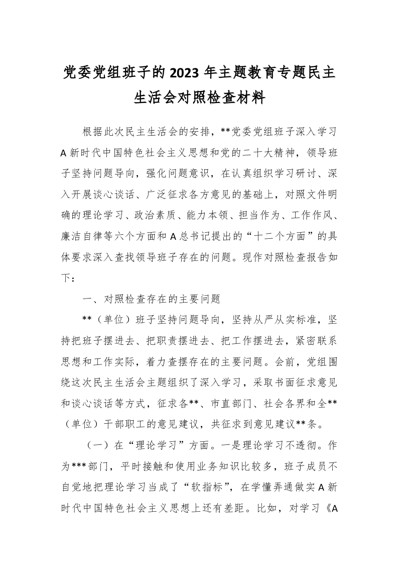 / 党委党组班子的2023年主题教育专题民主生活会对照检查材料