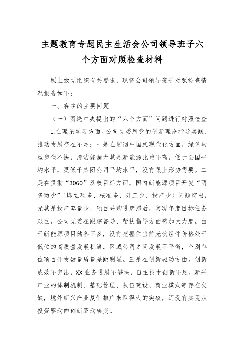 主题教育专题民主生活会公司领导班子六个方面对照检查材料