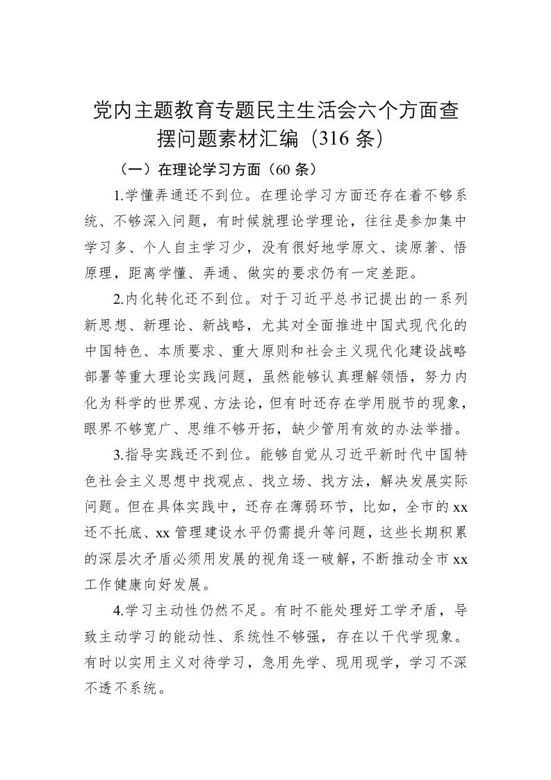 / 党内主题教育专题民主生活会六个方面查摆问题素材汇编(316条)