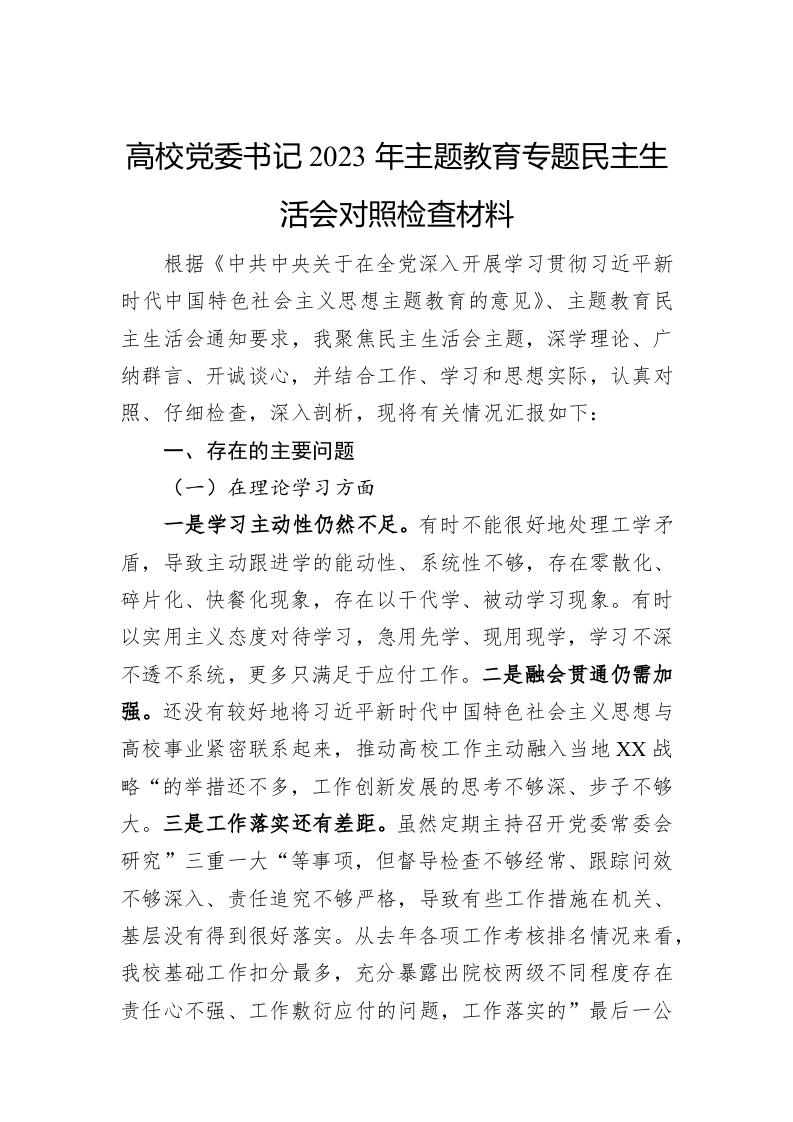 / 高校党委书记2023年主题教育专题民主生活会对照检查材料