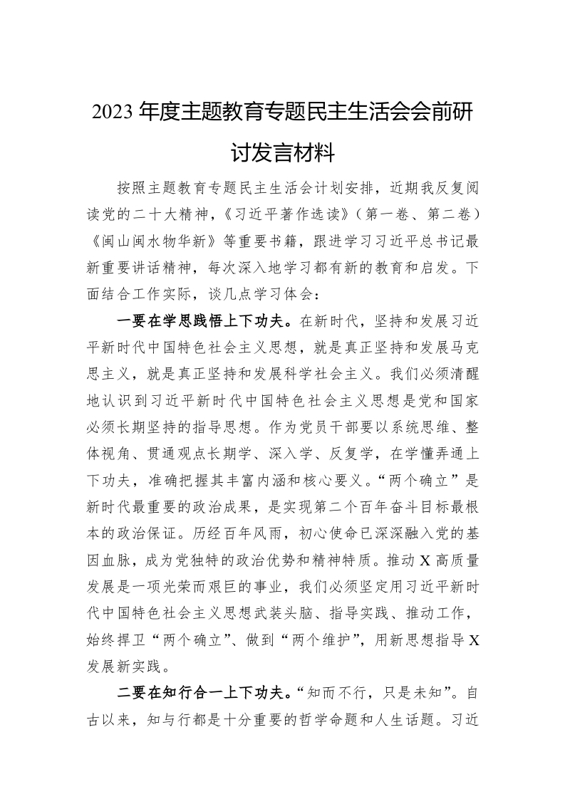 / 2023年度主题教育专题民主生活会会前研讨发言材料