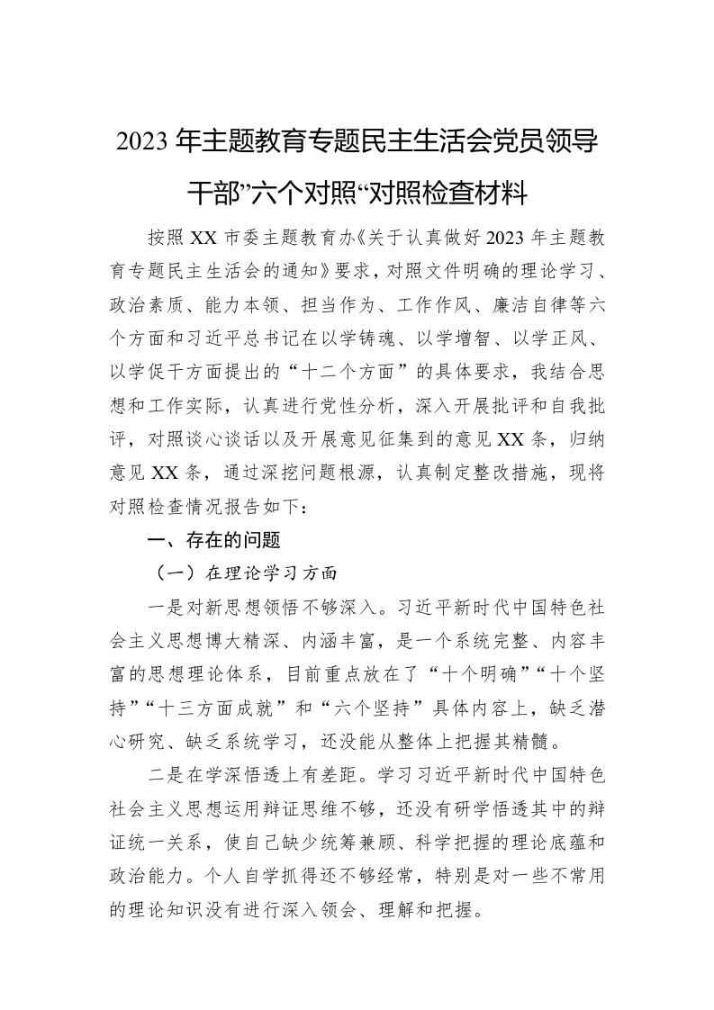 / 2023年主题教育专题民主生活会党员领导干部”六个对照“对照检查材料