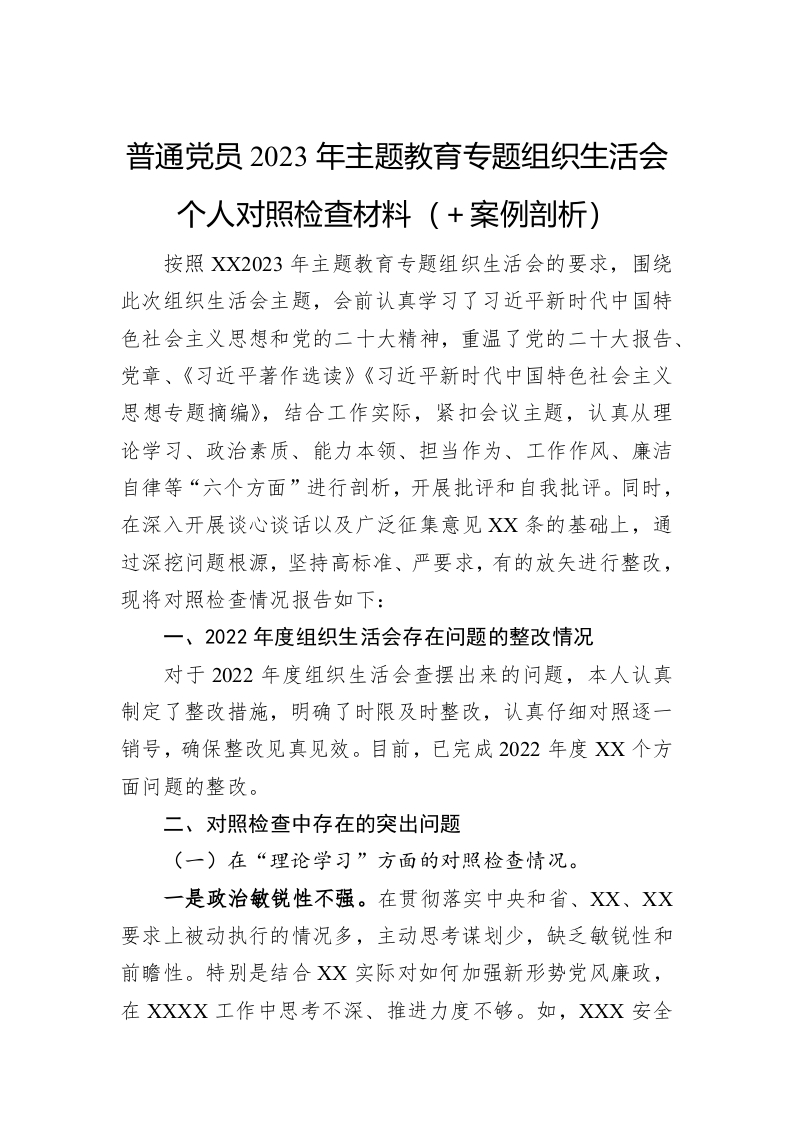 / 普通党员2023年主题教育专题组织生活会个人对照检查材料(+案例剖析)