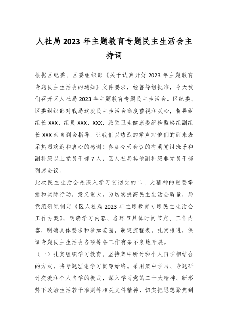 / 人社局2023年主题教育专题民主生活会主持词