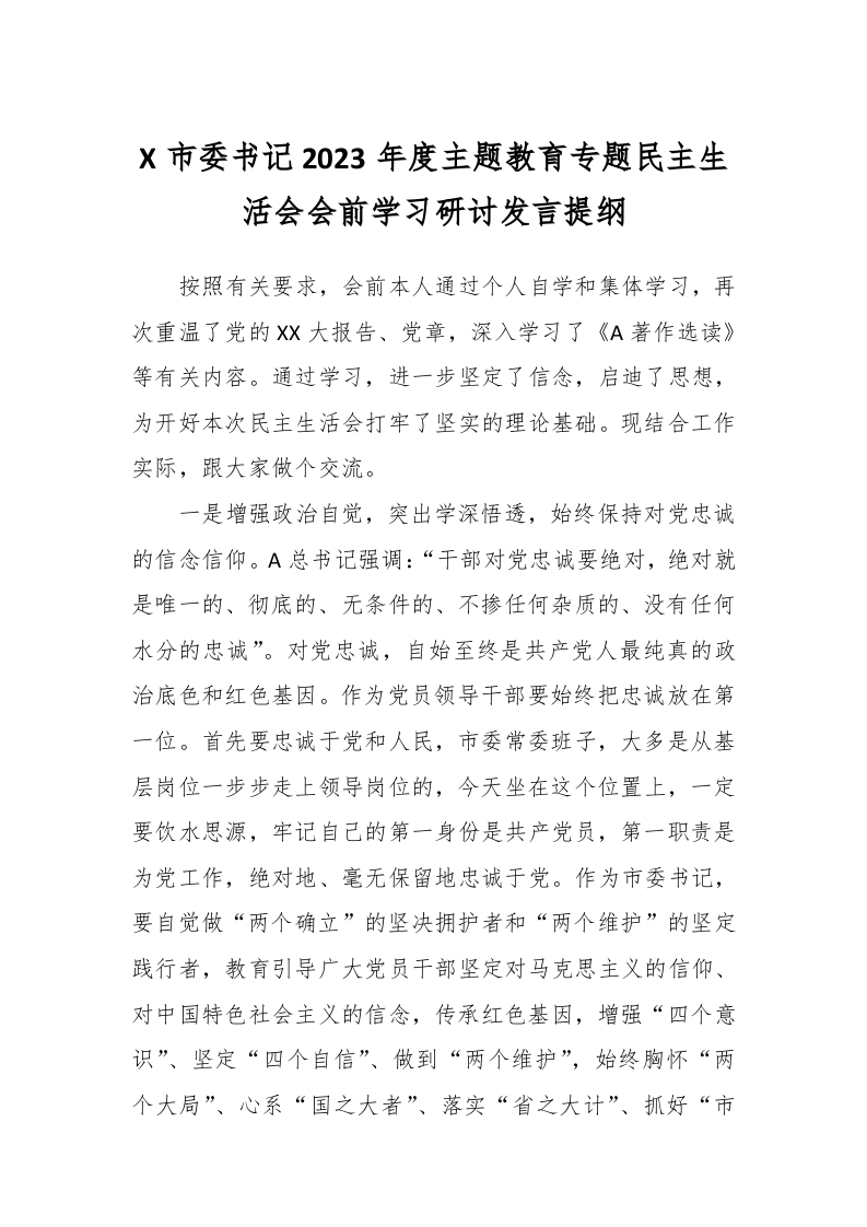 / X市委书记2023年度主题教育专题民主生活会会前学习研讨发言提纲