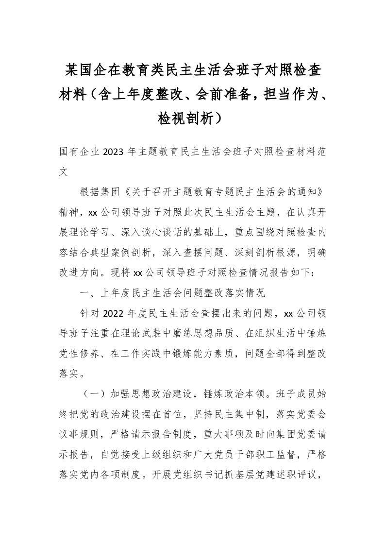 / 某国企在教育类民主生活会班子对照检查材料(含上年度整改、会前准备,担当作为、检视剖析)