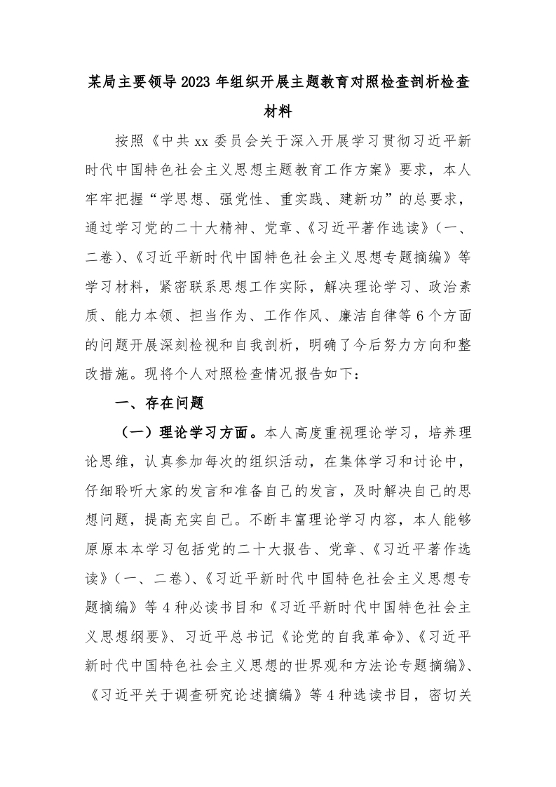 / 某局主要领导2023年组织开展主题教育对照检查剖析检查材料