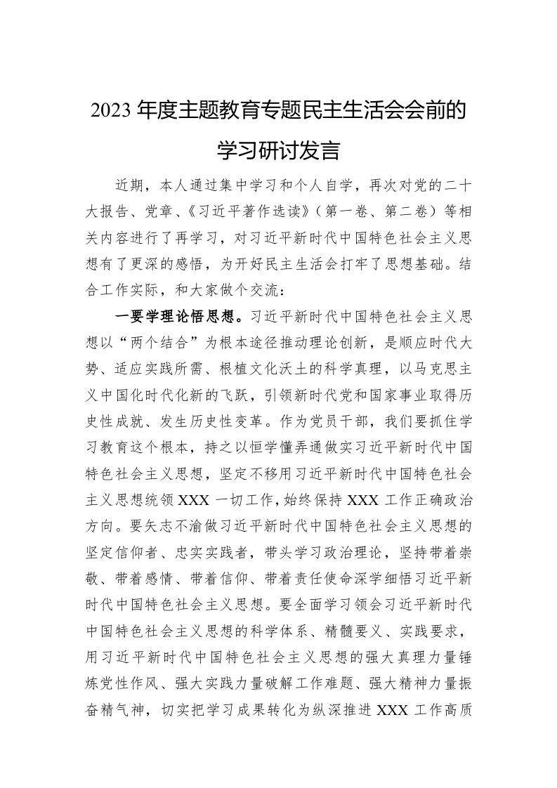 / 2023年度主题教育专题民主生活会会前的学习研讨发言