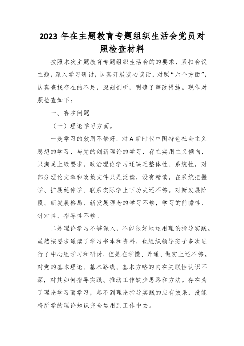 / 2023年在主题教育专题组织生活会党员对照检查材料