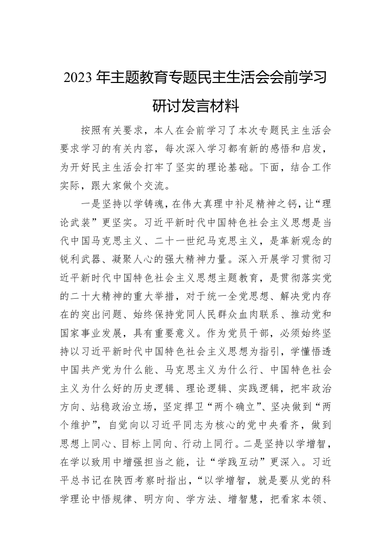 / 2023年主题教育专题民主生活会会前学习研讨发言材料
