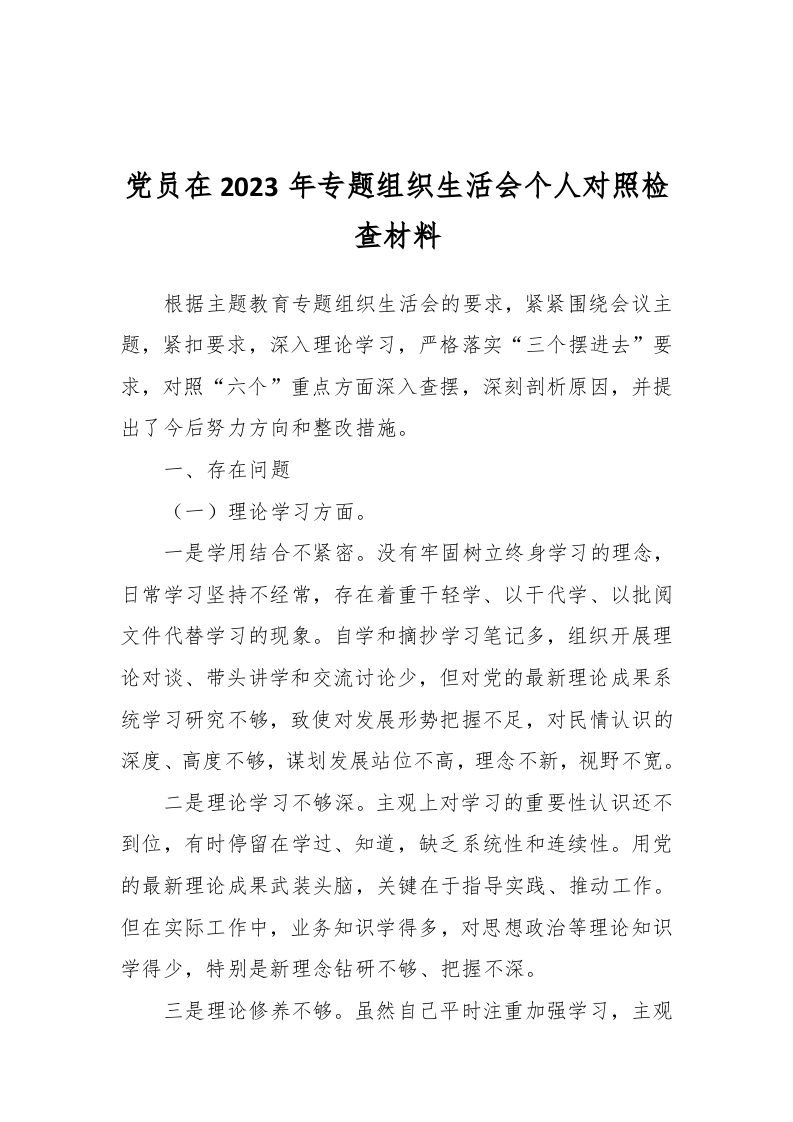 / 党员在2023年专题组织生活会个人对照检查材料