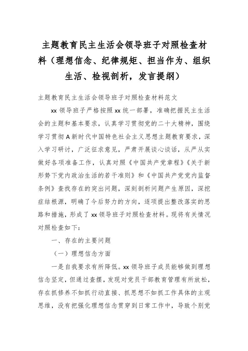 主题教育民主生活会领导班子对照检查材料(理想信念、纪律规矩、担当作为、组织生活、检视剖析,发言提纲)