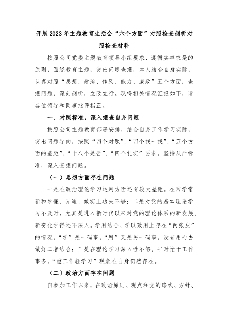 / 开展2023年主题教育生活会“六个方面”对照检查剖析对照检查材料
