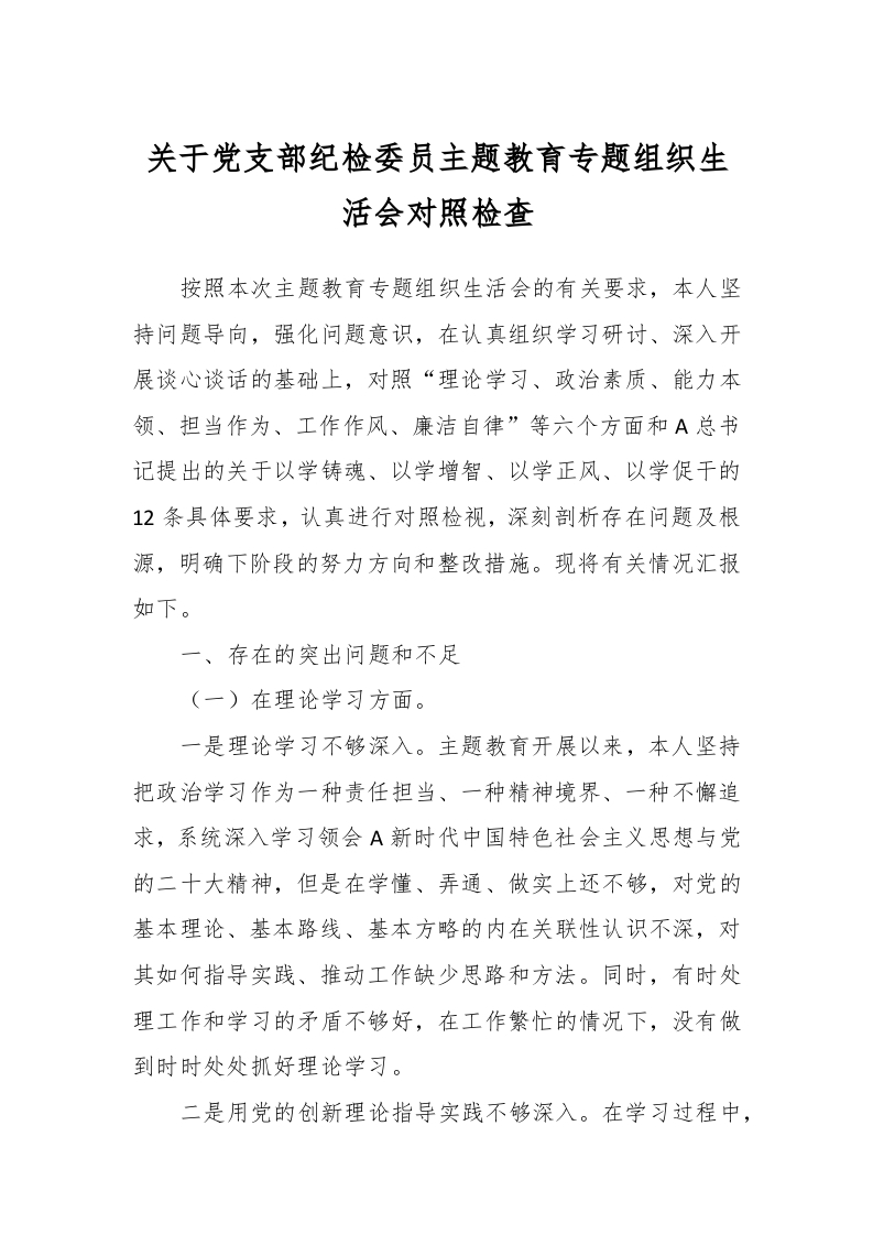 / 关于党支部纪检委员主题教育专题组 织生活会对照检查