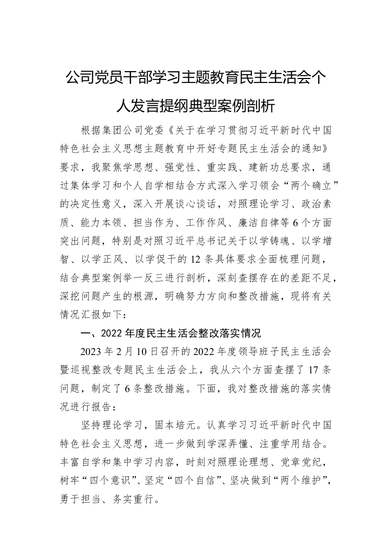 / 公司党员干部学习主题教育民主生活会个人发言提纲典型案例剖析