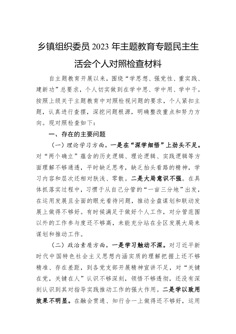 / 乡镇组织委员2023年主题教育专题民主生活会个人对照检查材料