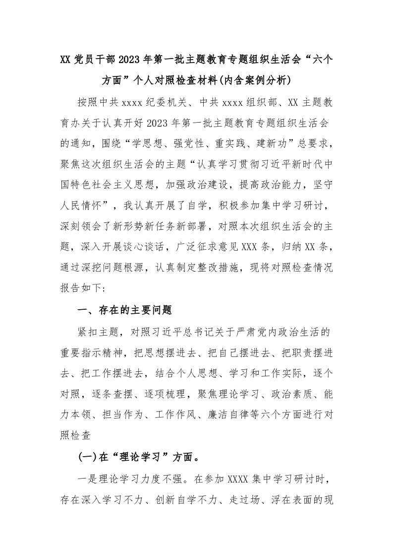 XX党员干部2023年第一批主题教育专题组织生活会“六个方面”个人对照检查材料(内含案例分析)