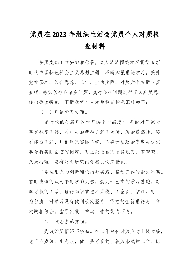 / 党员在2023年组织生活会党员个人对照检查材料